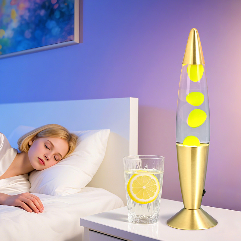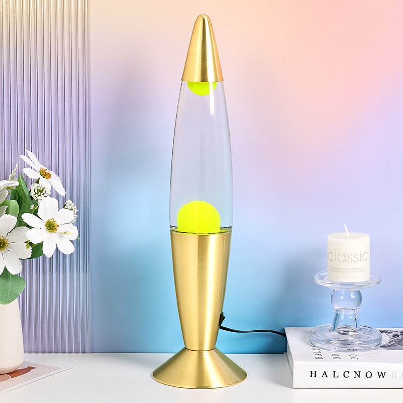 24VВосочна ламба со луксузна портокалова лава ламба од 16 инчи има чиста вода во проѕирното стакло и зелен восок внатре. Откако ќе се загрее, восокот плови неправилно во водата, што е многу ценето.
