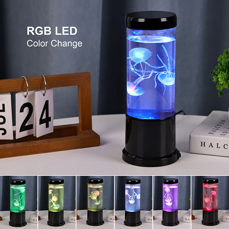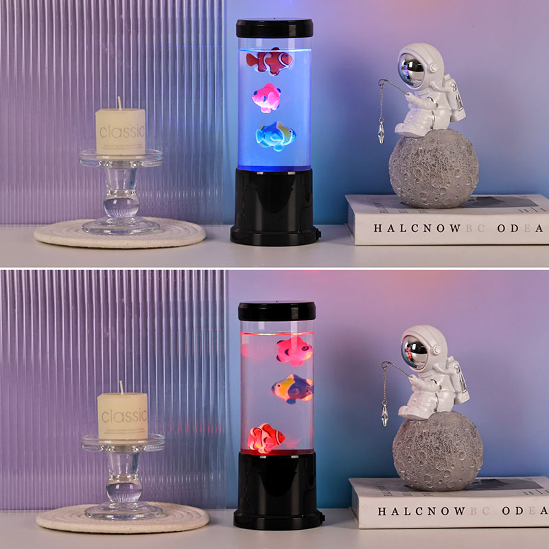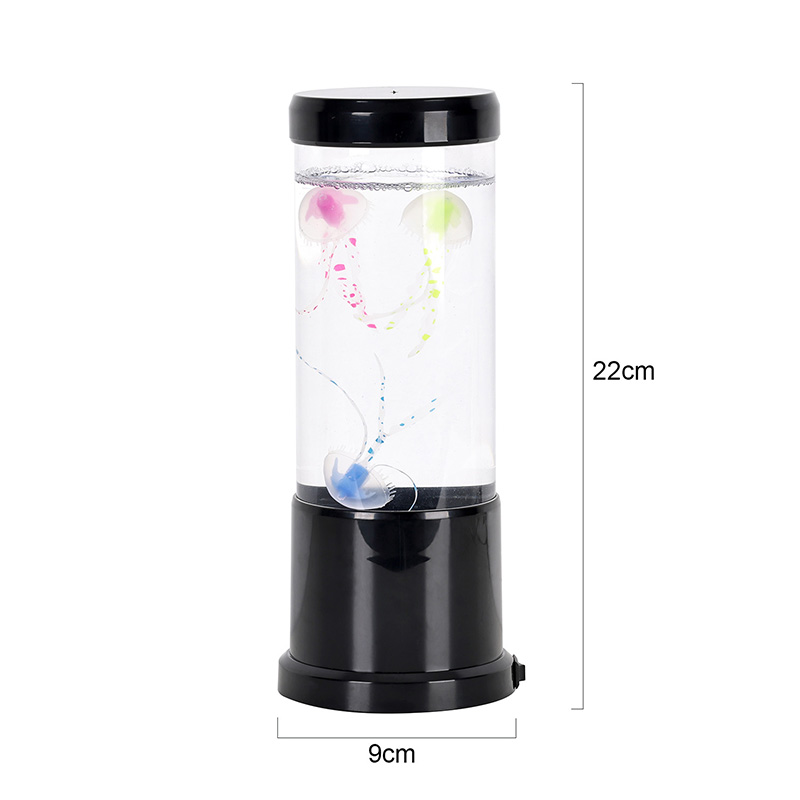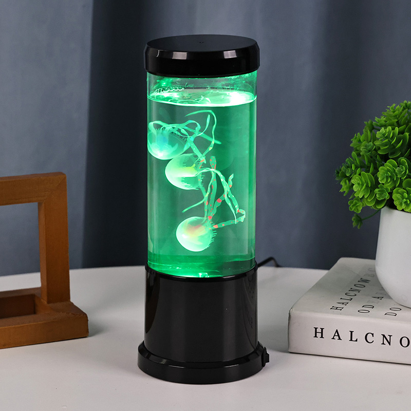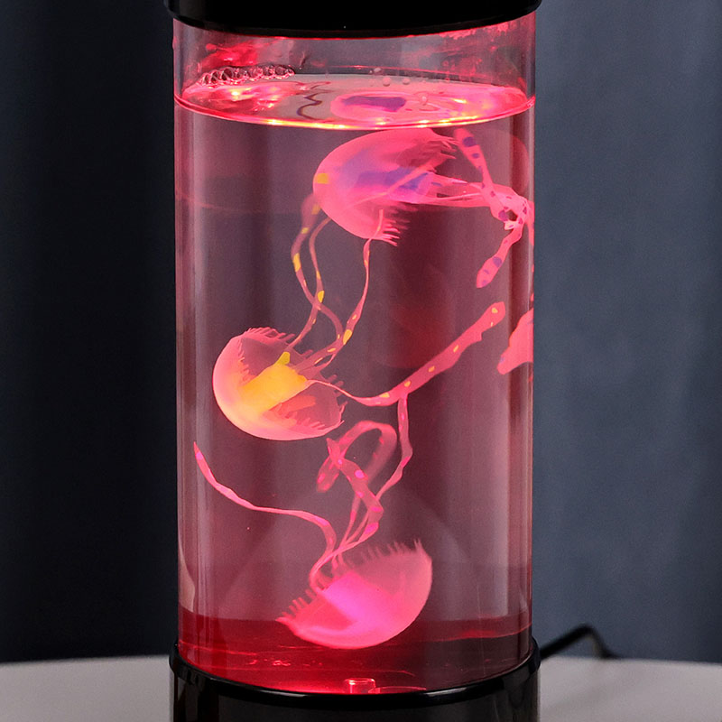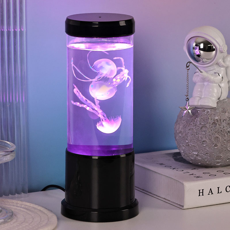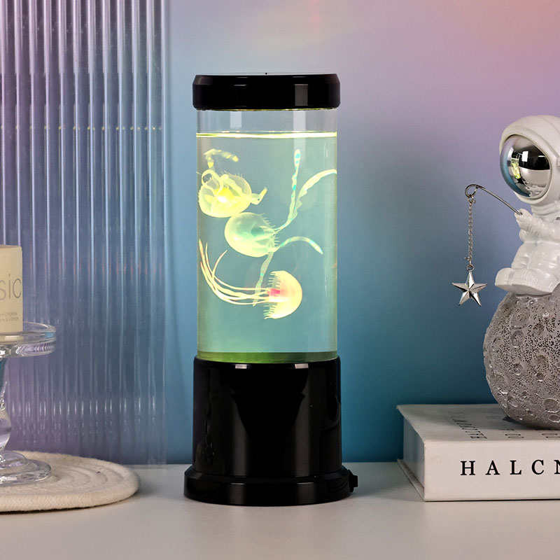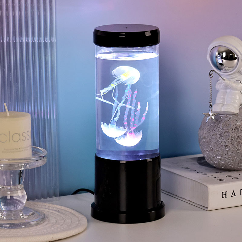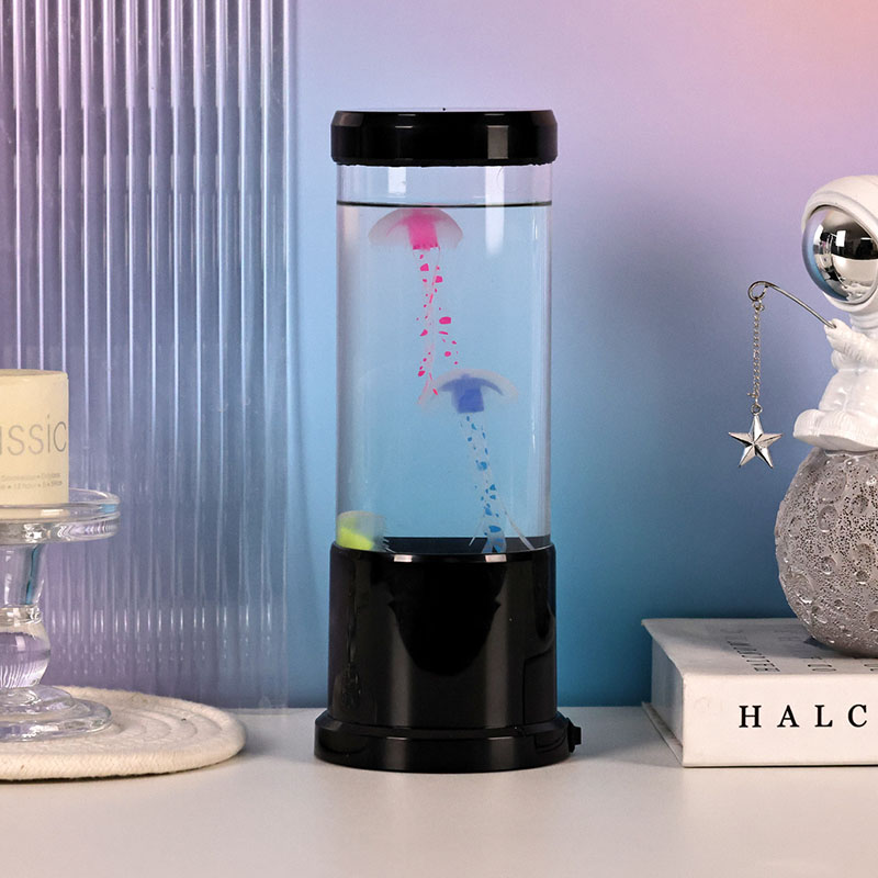 светилката има живописна медуза во црна нијанса која нежно лебди во проѕирен цилиндричен резервоар, создавајќи смирувачки подводен амбиент кој ја трансформира секоја просторија во спокојно океанско прибежиште.