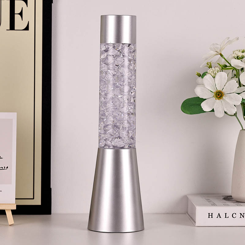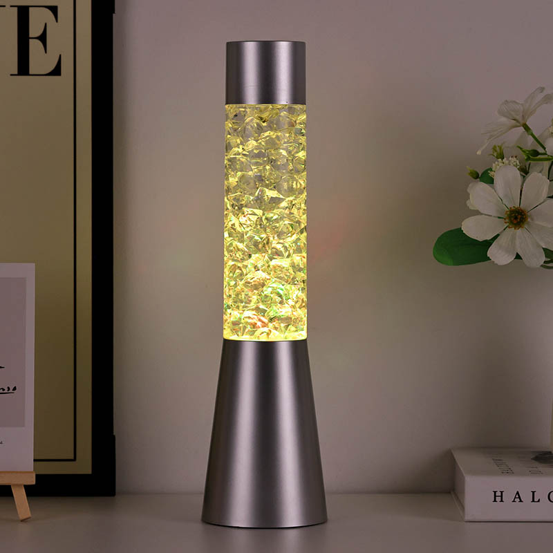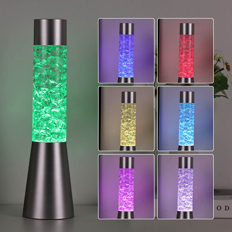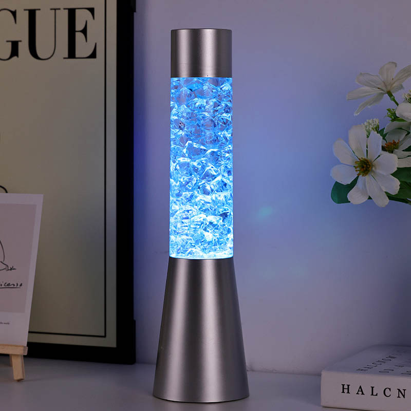 Течното сјајно ноќно светло за промена на бојата со облик на мраз има елегантен и модерен дизајн со метална основа и проѕирен горен дел исполнет со шарени парчиња налик на кристал. Основата на светилката е дизајнирана да биде стабилна и елегантна, надополнувајќи го секој стил на уредување на домот. Во проѕирниот дел се сместени шарените парчиња кои нежно се движат, создавајќи хипнотизирачки визуелен ефект. Светилката е достапна во три различни варијации на бои - црвена, сина и зелена - што ви овозможува да изберете совршена нијанса што одговара на вашиот внатрешен декор.