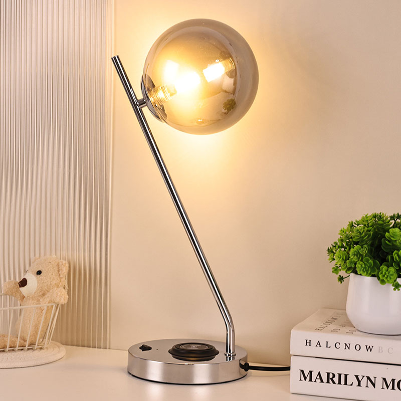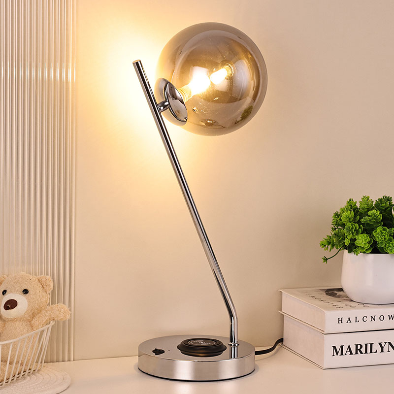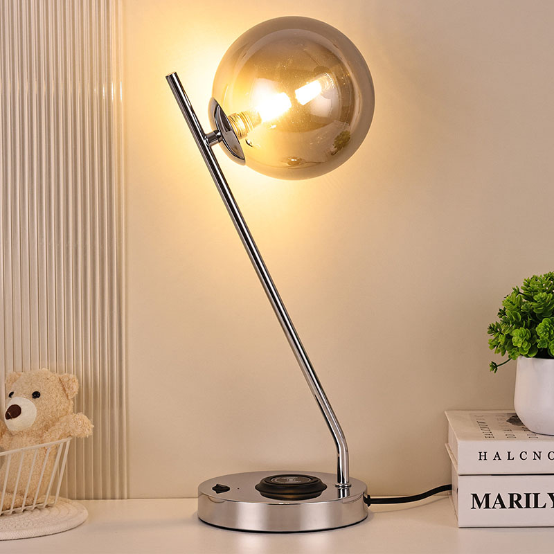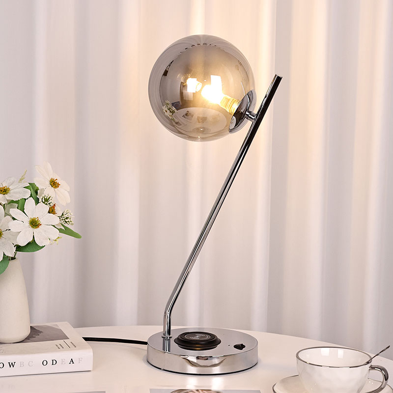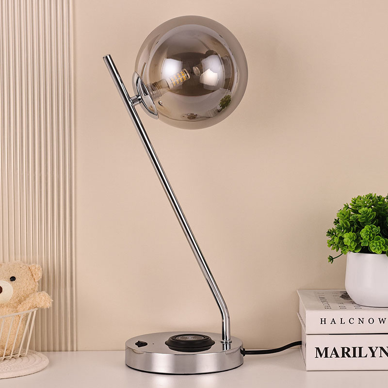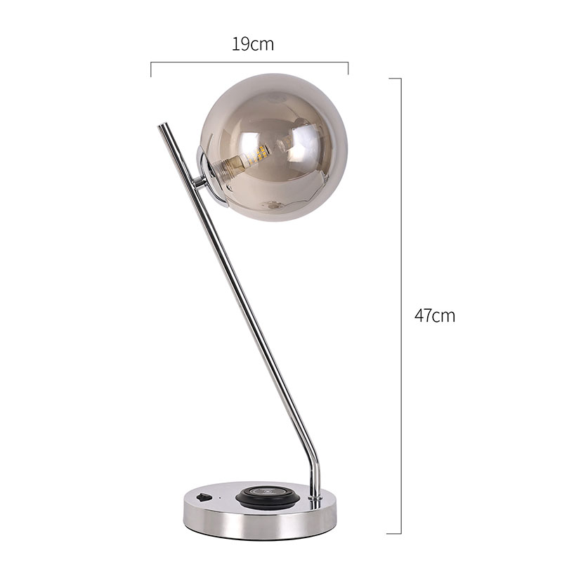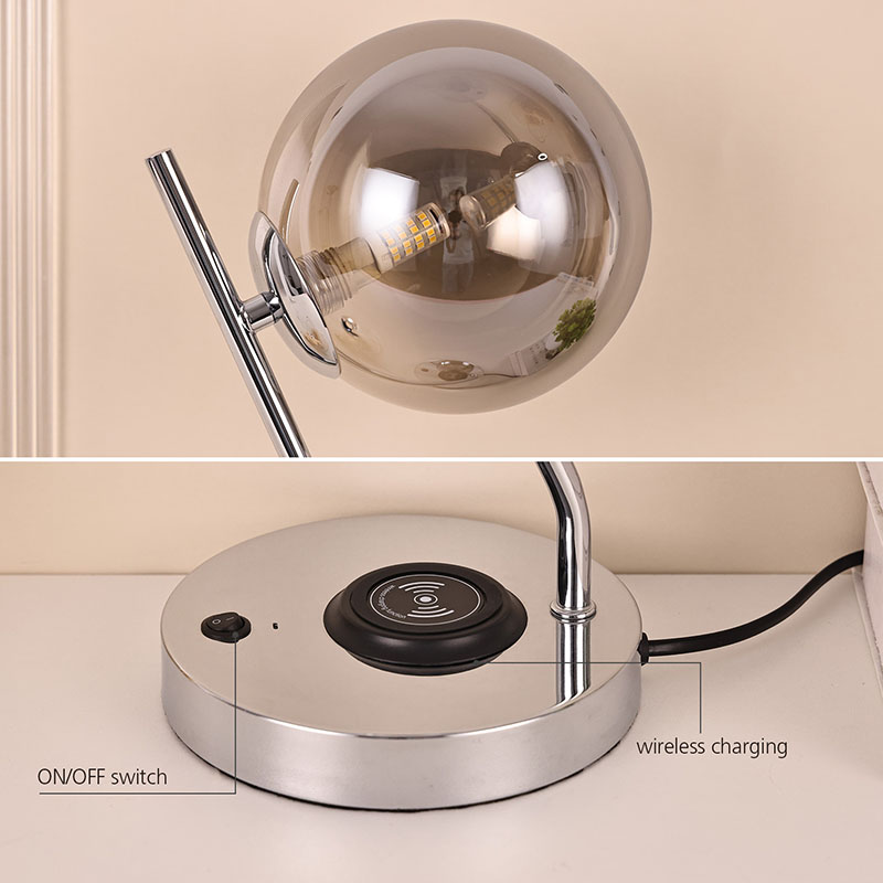 Темно стаклена топчеста светилка за маса со безжичен полнач е изработена во метална база и стакло. Металната основа е фино полирана и обработена, со мазна и нежна површина, удобна на допир и зрачи со благородна и елегантна атмосфера. Без разлика дали е сместена во спална, дневна или работна соба, оваа ламба за маса може совршено да се вклопи со околината, додавајќи модерна и уметничка атмосфера