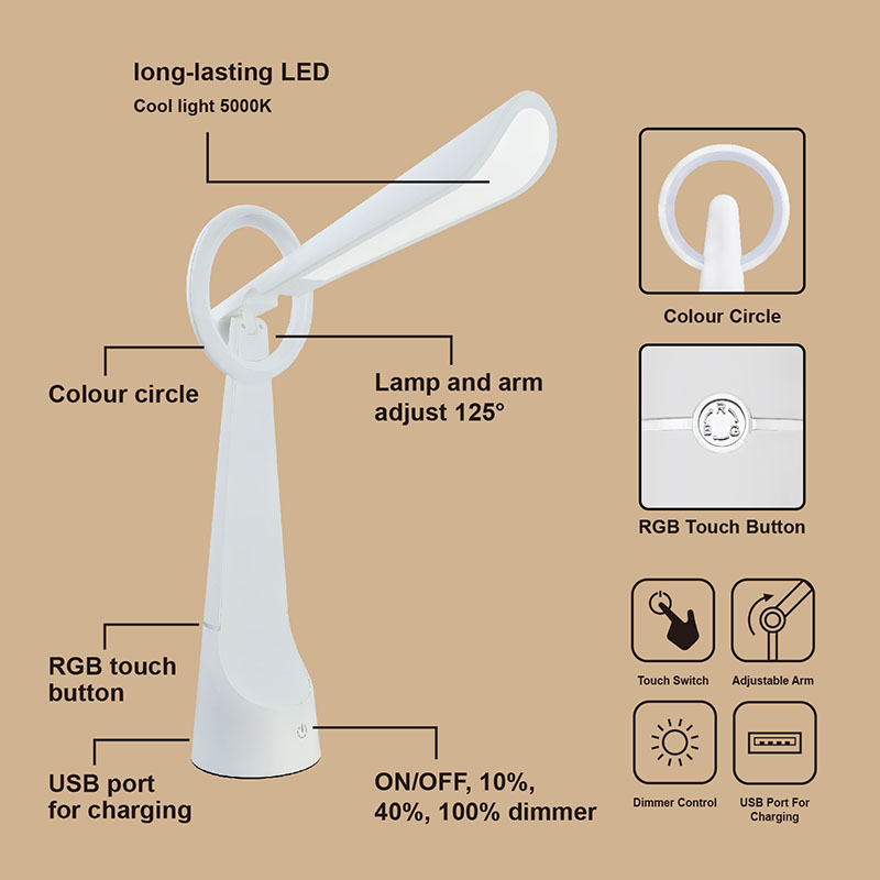 Декор ргб LED светилка за работна маса може 3 да го затемни грбот на телото на производот. Главата на LED светло може да се отвори 125° max.