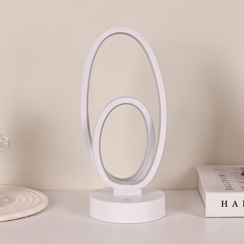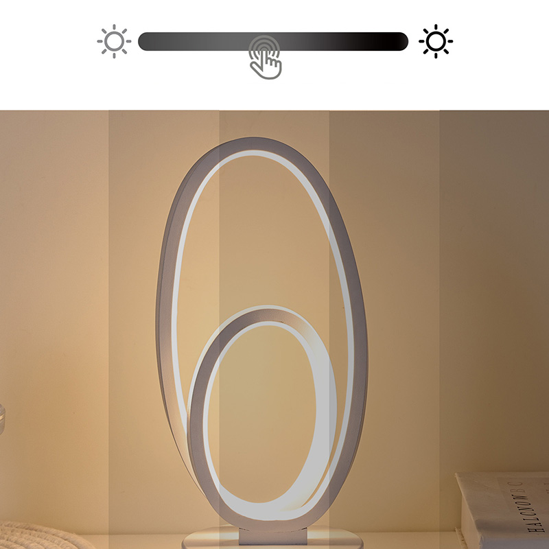 44*33*В23,5смДвојна кружна нијанса на прстен RGB светилка за работна маса има дизајн со двоен прстен, со елегантни контури оцртани со минималистички линии. Комбинирајќи метал и висококвалитетна пластика, може да се пофали со исклучителна текстура и нежен допир. Покрај тоа што е алатка за осветлување, тоа