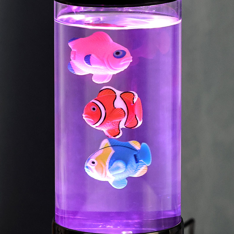 Внатре во проѕирниот резервоар, живописни вештачки риби благодатно лизгаат нагоре и надолу во синхронизација со нежни струи на меурчиња што се издигнуваат од дното. Овие прекрасно детални риби, дизајнирани со живописни бои и реални текстури, изгледаат како да пливаат природно додека се носат од меката струја создадена од вградената воздушна пумпа. Движењето е смирувачко и хипнотичко, создавајќи смирувачко визуелно искуство кое помага да се намали стресот и да се промовира релаксација.