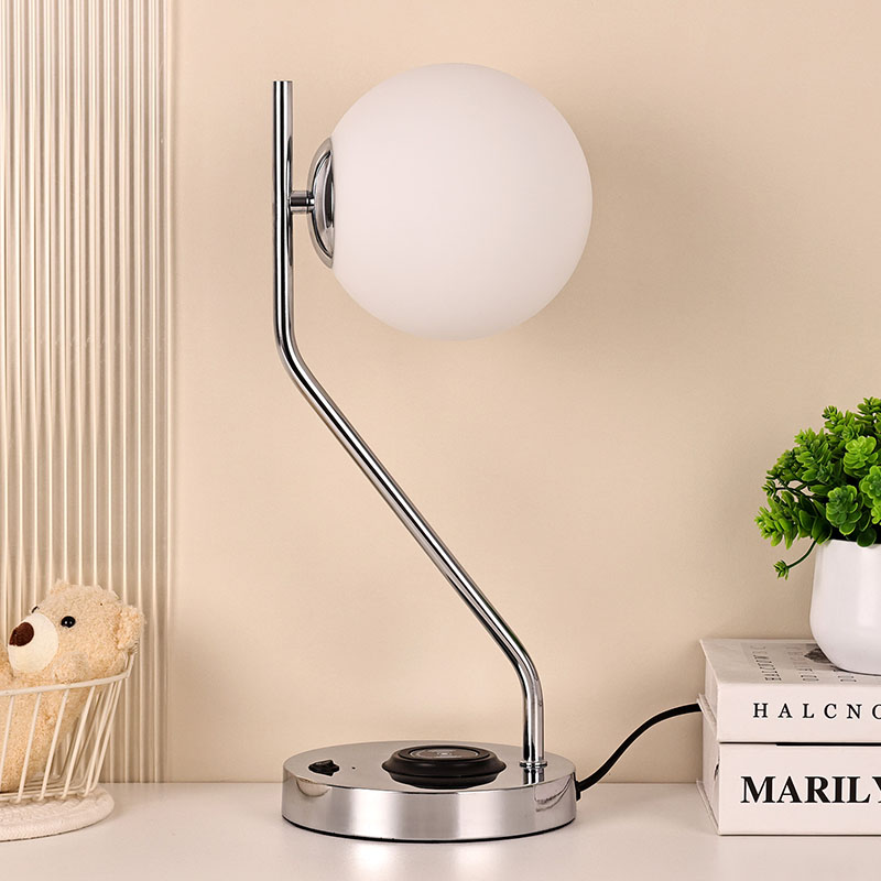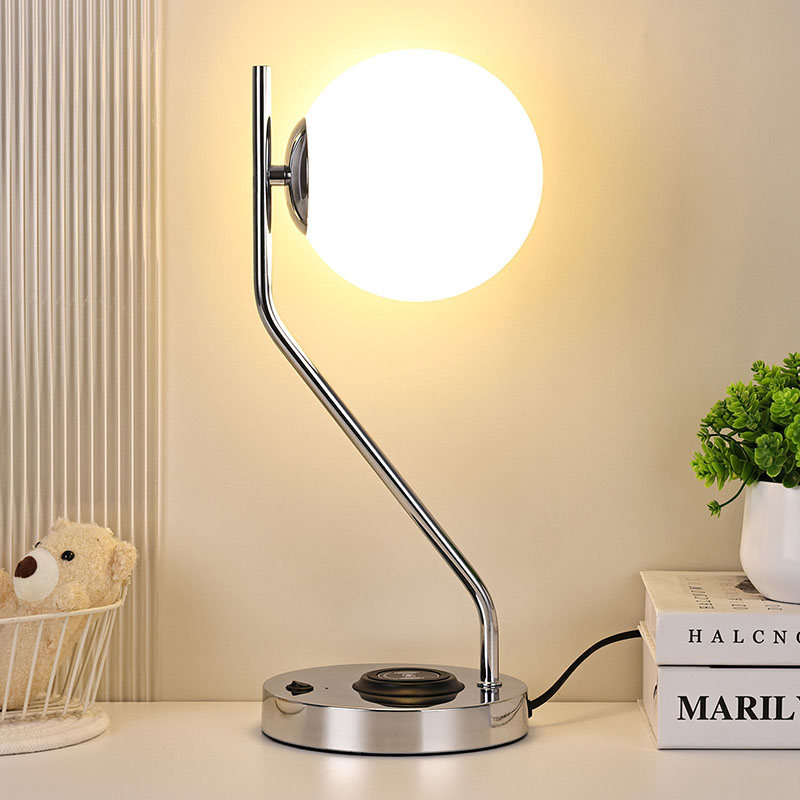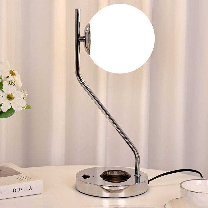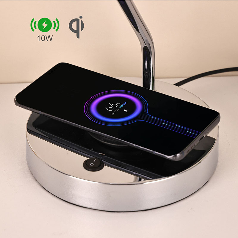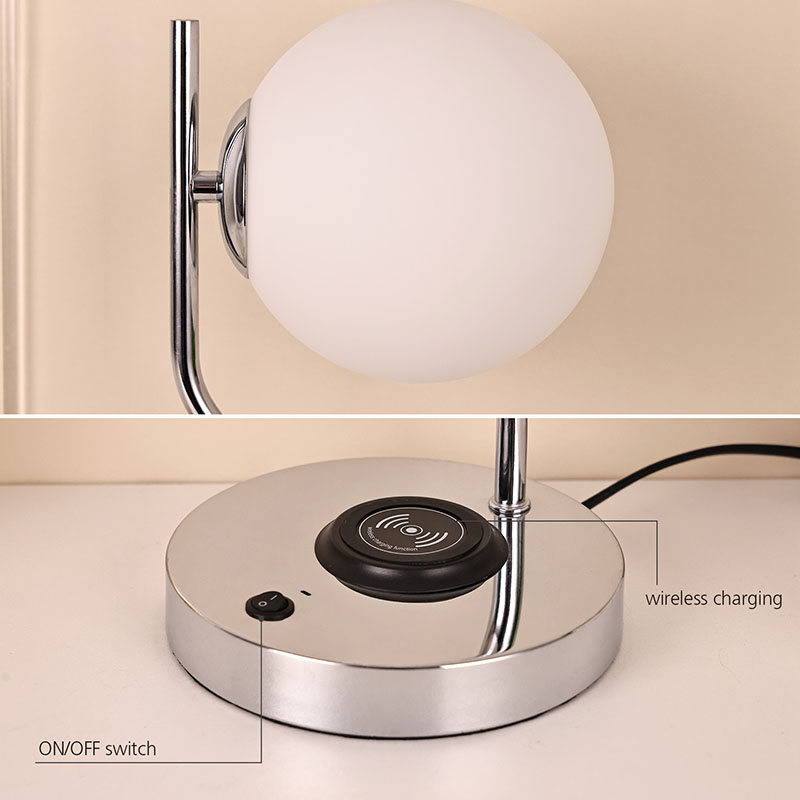 Стаклена светилка за работна маса со безжичен полнач е опремена и со метална безжична база за полнење мобилен телефон. Едноставно поставете го телефонот со овозможено безжично полнење нежно на основата за брзо полнење, без потреба од досадни