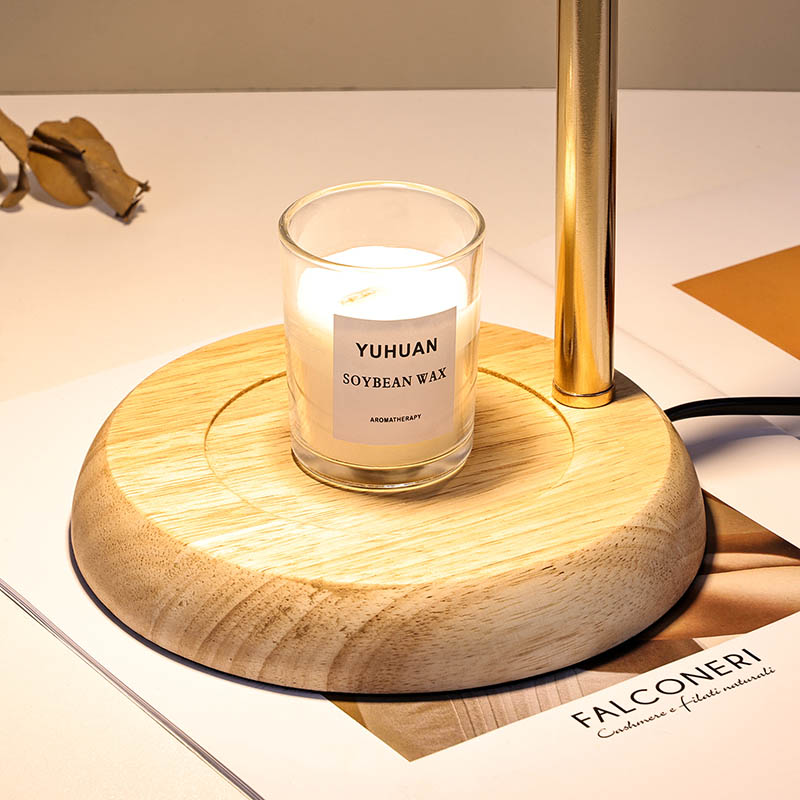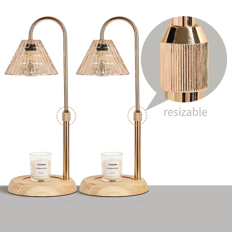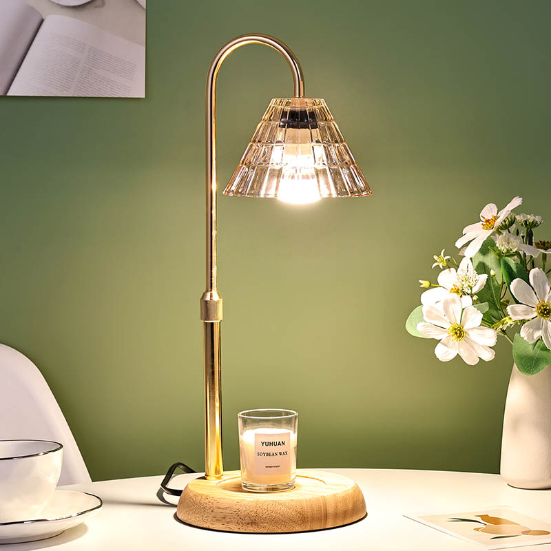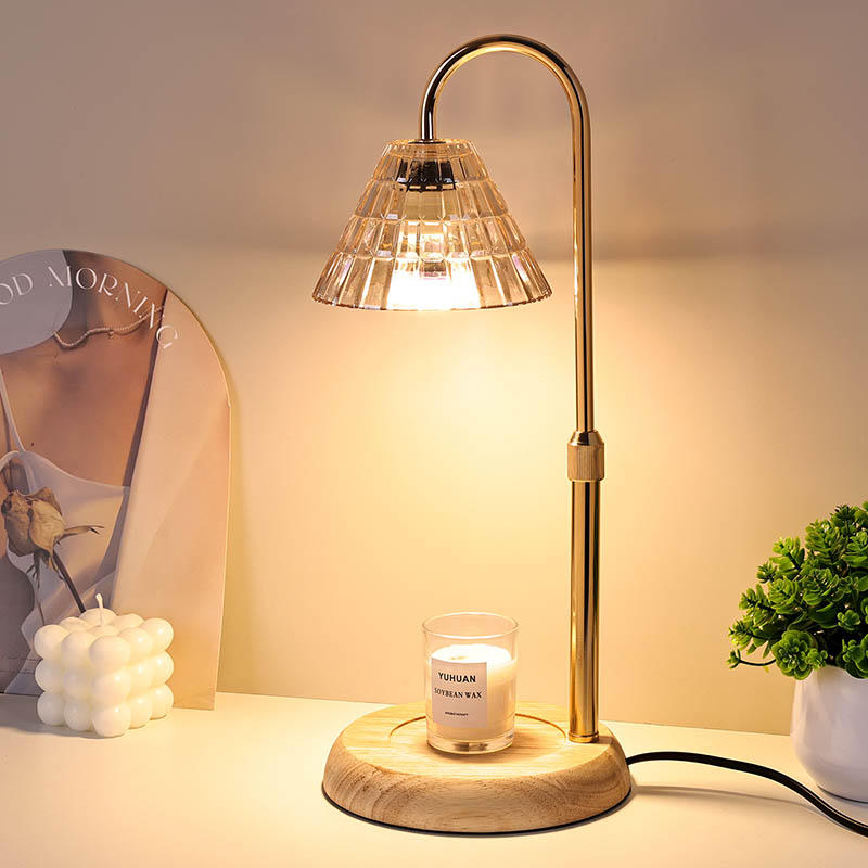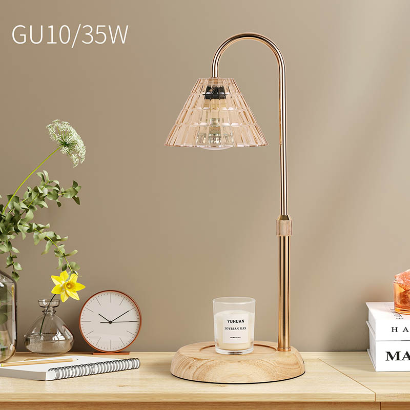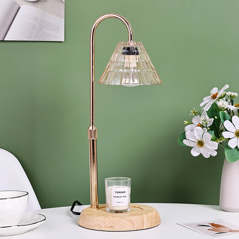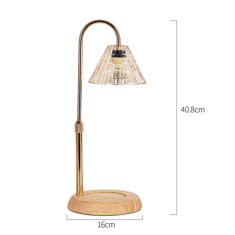 Стаклена светилка за на маса со приспособена висина е традиционален стил на дизајн, кој се состои од традиционална сијалица со дрвена основа и златна метална столица за светилка.