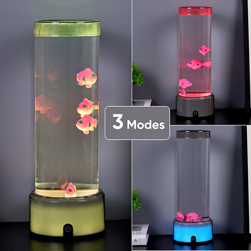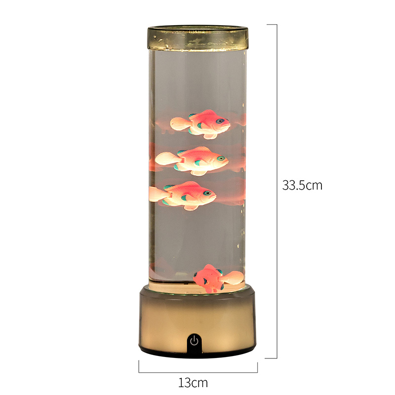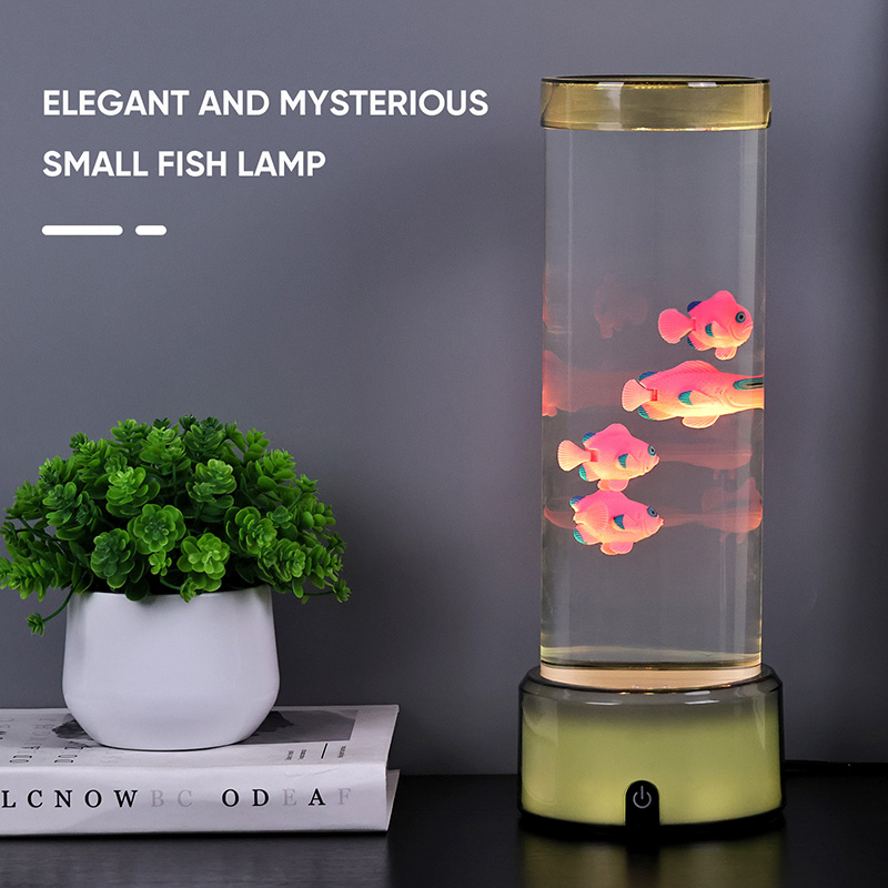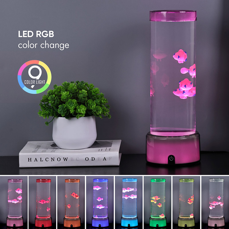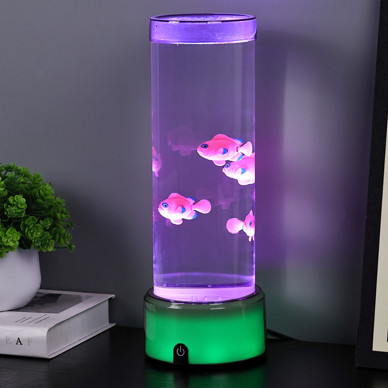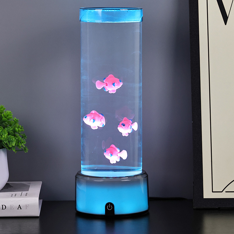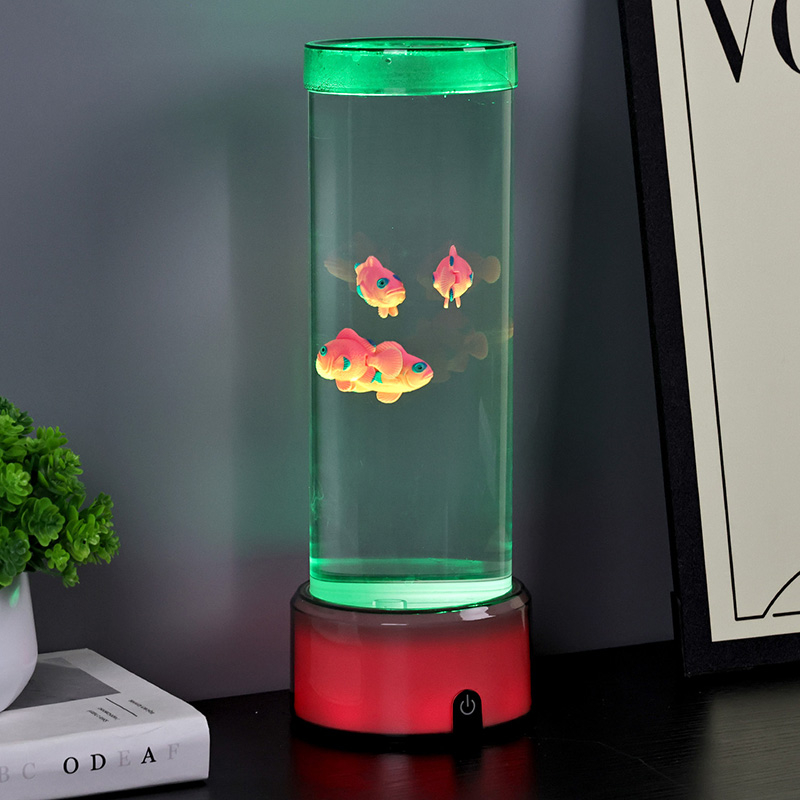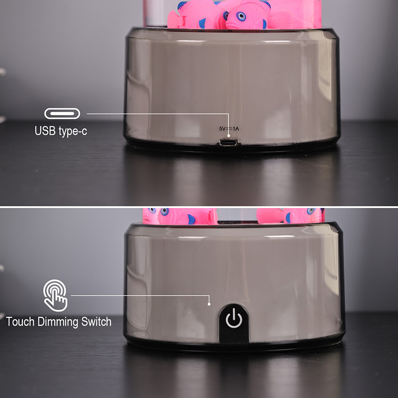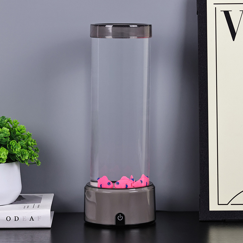 Допрете го прекинувачот за избор и пливање со медузаСветилка за риби од медуза со украсна ламба за основа RGB, новодизајнирана детска играчка за гледање со цилиндричен дизајн за задржување вода. По полнењето со вода, внатре се ставаат три мали риби. Светилката за риби од медуза со RGB основа може да плива нагоре и надолу кога ќе се ротира малиот мотор на дното. Во исто време, основата има RGB трансформација на боја. Најголемиот белег на овој производ е тоа што основата исто така се менува со трансформацијата на бојата. Целосно пластичниот дизајн е многу лесен без задржување вода, што е многу погодно за транспорт. Изворот на енергија на рибната светилка е обезбеден од USB тип C низок напон, што е многу погодно