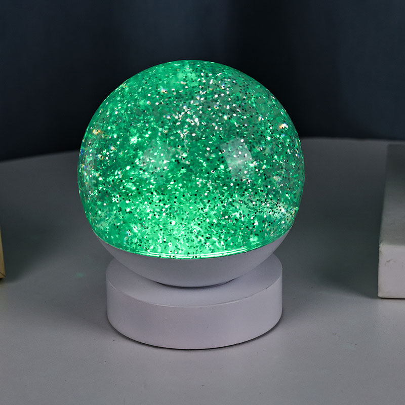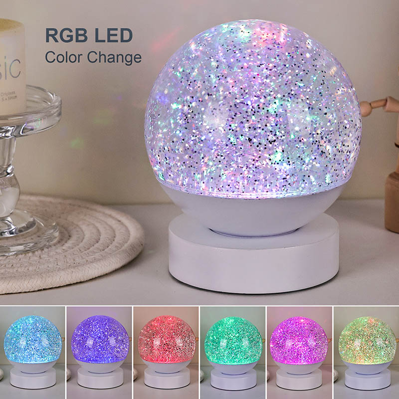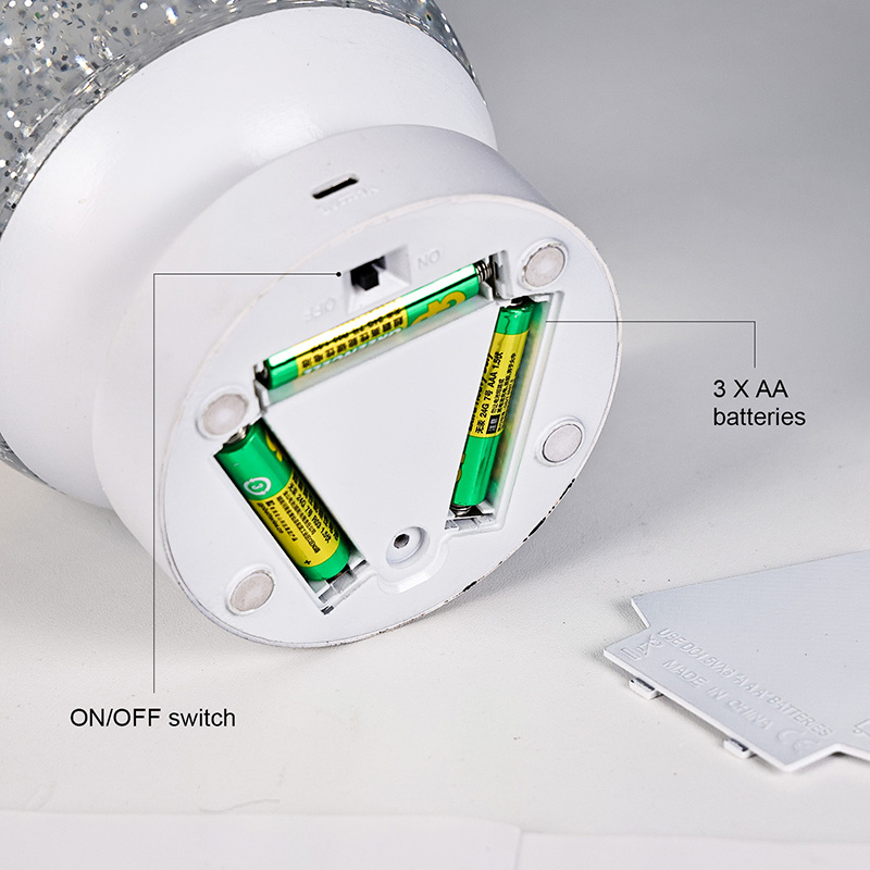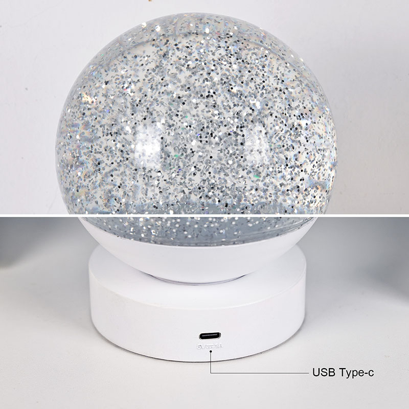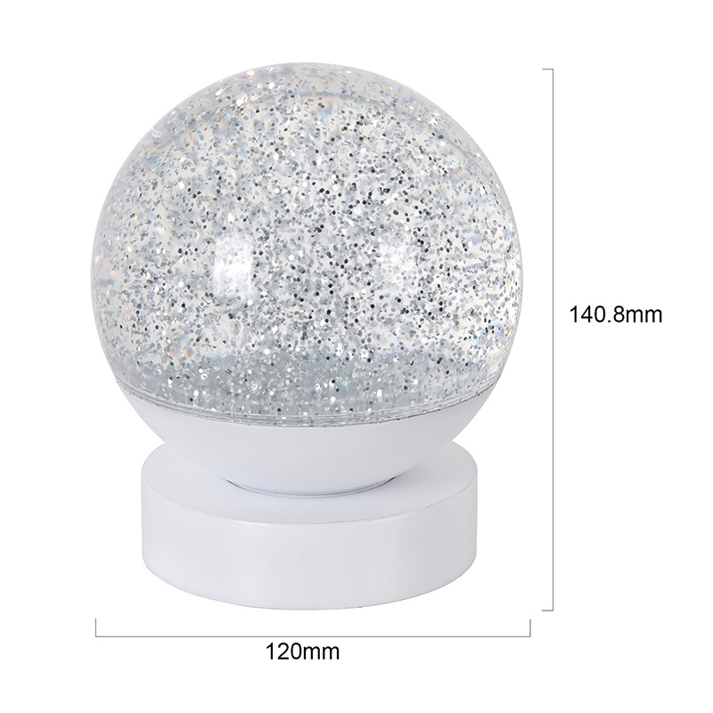 Led RGB Glitter Decor Lamp е изработена од висококвалитетен акрилен материјал, со проѕирна сфера со одличен пренос на светлина. Основата е изработена од еколошка ABS пластика, обезбедувајќи стабилност, издржливост и безбедност без токсични материи. Работи на три вградени ААА батерии (батериите се продаваат одделно), елиминирајќи ја потребата од штекер и нудејќи удобна употреба. Совршен за сместување покрај креветот, биро или во катче за детска играчка. Со едноставен прекинувач на допир, светлото може лесно да се вклучи или исклучи, што го прави лесен за користење дури и за децата да работат самостојно.