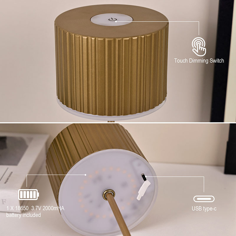 Прекинувач на допир (Тип-в полнење)Со цел да се задоволат потребите за осветлување во различни сценарија, мала столна ламба со метална сенка со батерија е опремена со напредна функција за затемнување со 3 брзини. Со едноставни операции, можете слободно да го прилагодите интензитетот на осветлувањето.
