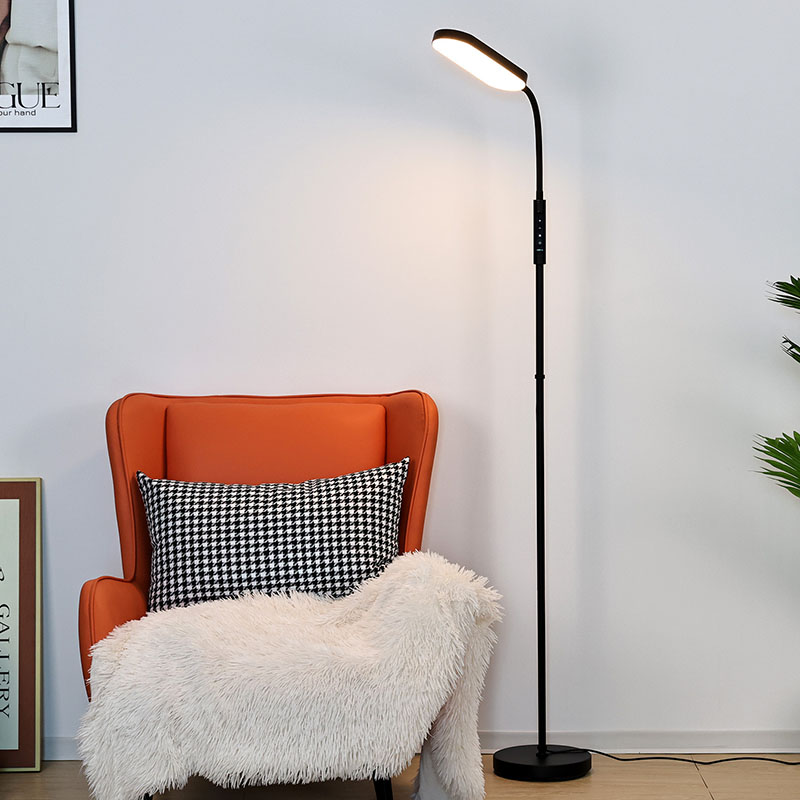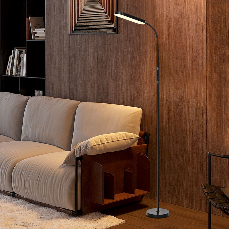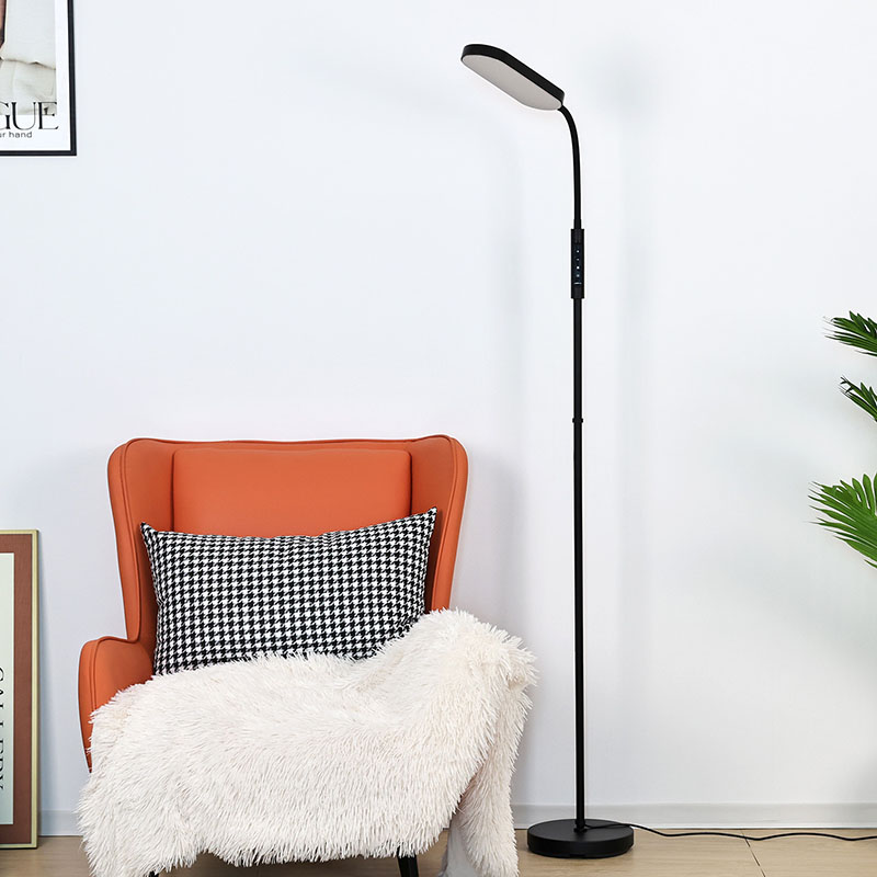 Модерната LED стоечка светилка за дневна соба прифаќа минималистички концепт на дизајн, со едноставна и линеарна целокупна форма. Дизајнот со еден столб не само што заштедува простор, туку и им дава на уредите за осветлување уникатна естетика. Црната метална шипка и основата се фино полирани и обработени, со мазна и нежна површина, мек сјај и ниска, но благородна атмосфера.