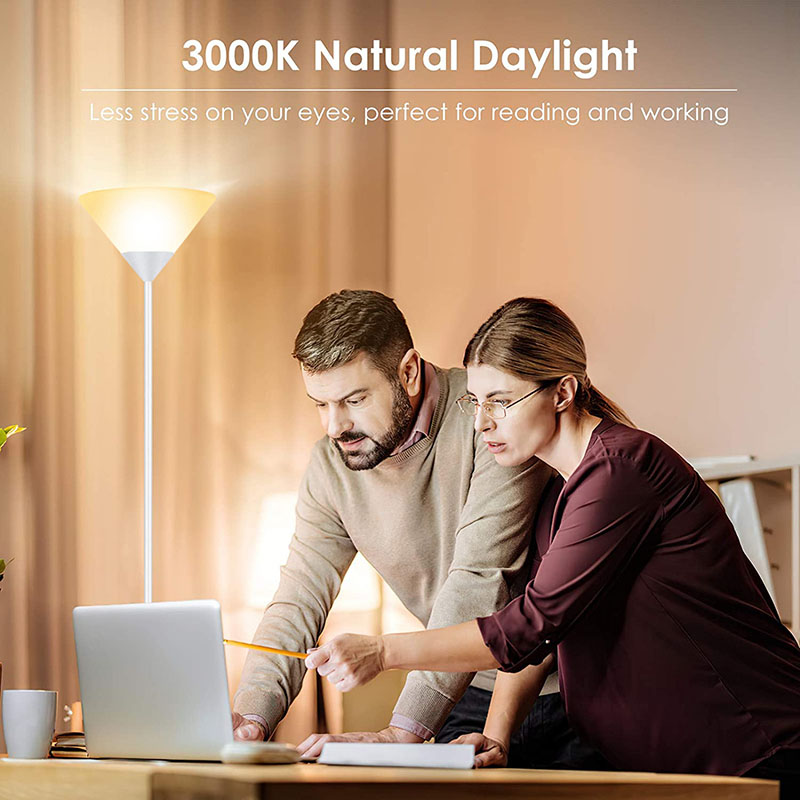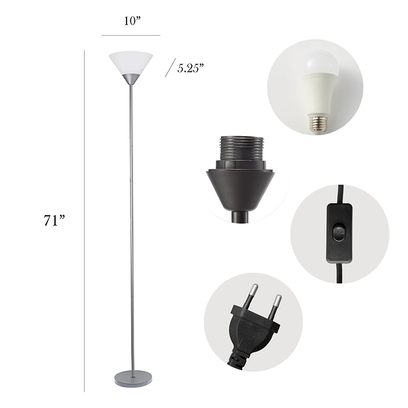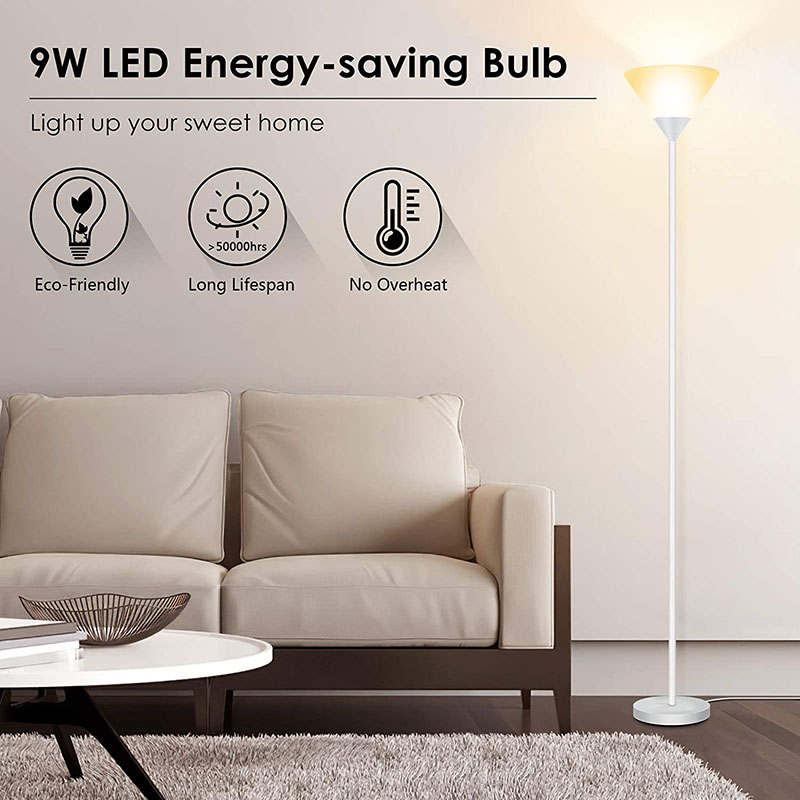 Изработена од висококвалитетни материјали, разноврсната LED подна ламба има цврста метална рамка и издржлива пластична сенка. Неговиот минималистички дизајн обезбедува беспрекорно вклопување во секој внатрешен декор, без разлика дали е модерен, традиционален или еклектичен. Структурата со една прачка на светилката обезбедува стабилност и чиста естетика, додека конусната нијанса ја насочува светлината нагоре, создавајќи пријатен амбиент.