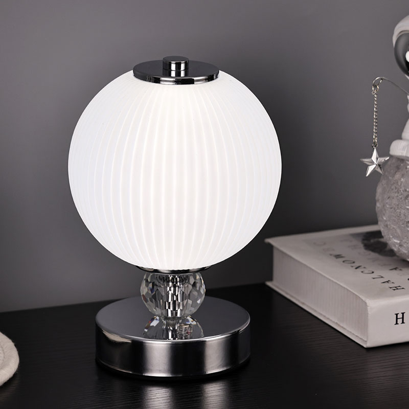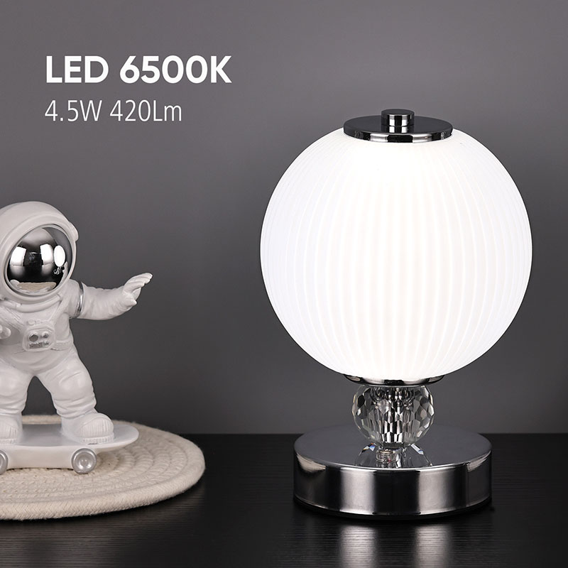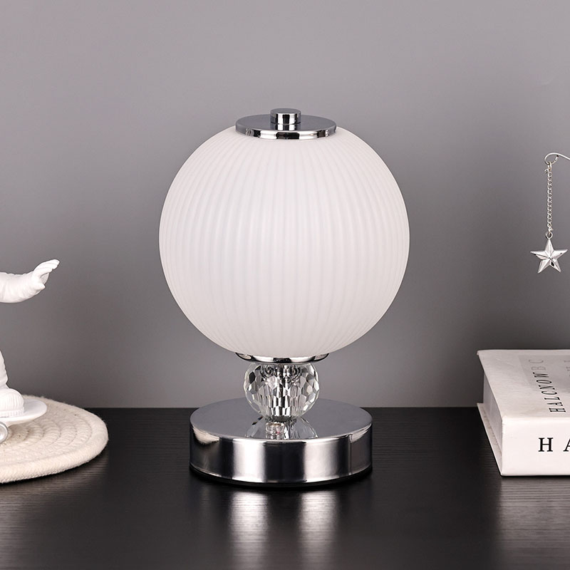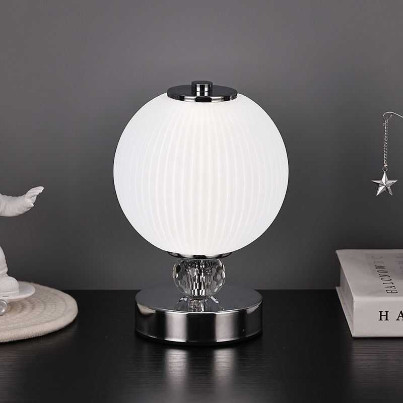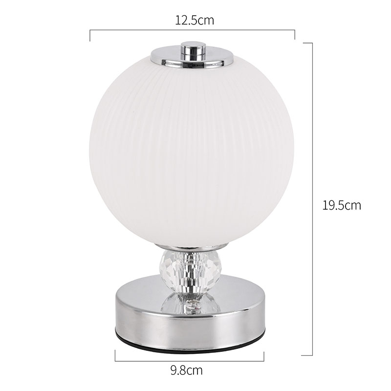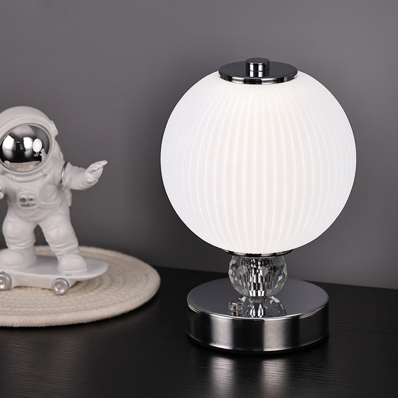 Најголемиот белег на оваа мини светилка за работна маса е нејзиниот уникатен сферичен дизајн на абажур. Абажурот е изработен од висококвалитетен стаклен материјал, со мазна и нежна површина и мек сјај. Дизајнот на сферичниот абажур не само што и дава на светилката чиста и благородна текстура, туку и овозможува светлината да се емитува порамномерно, создавајќи мека и топла атмосфера.
