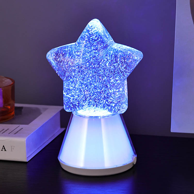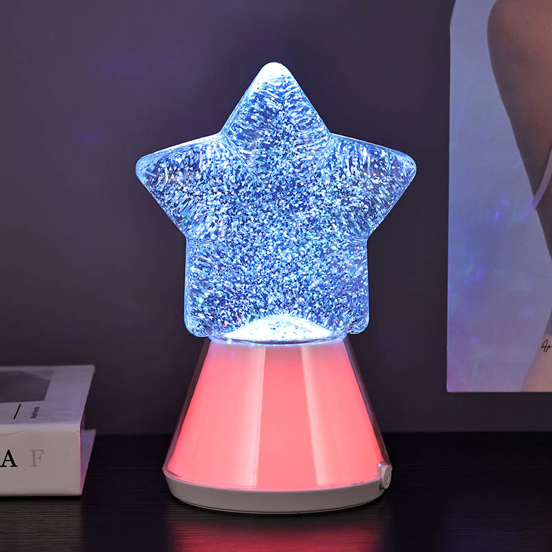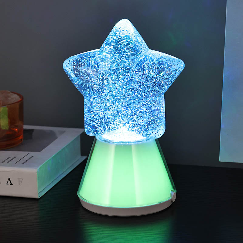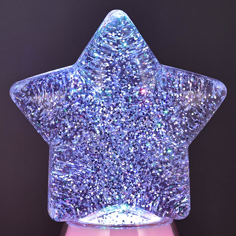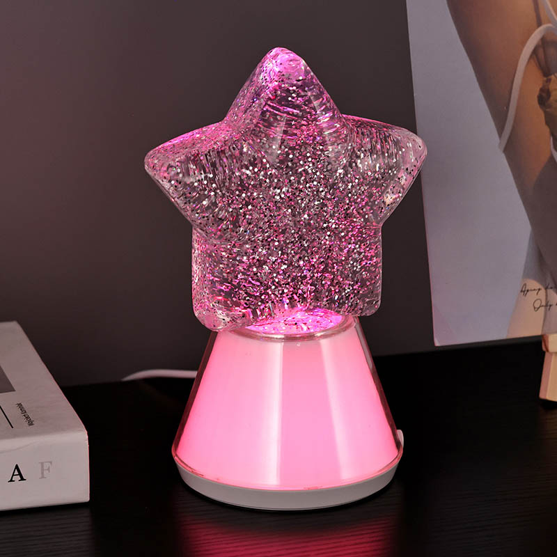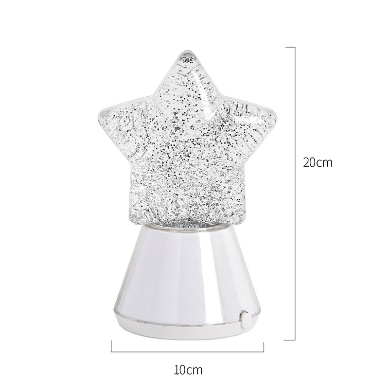 Магијата на ноќта со нашата starвездена ноќна декоративна ламба има зачудувачки дизајн во форма на starвезда што ја доловува суштината на небесната убавина. Изработена од висококвалитетни материјали, оваа ламба може да се пофали со основа направена од транспарентна пластика што ја менува бојата во синхронизација со внатрешните LED светла RGB. Самата starвезда е исполнета со треперливи сјајни честички суспендирани во течност, создавајќи привлечен визуелен ефект додека се осветлува ламбата. Бидејќи боите циклус низ спектар на живописни нијанси, сјајот танцува во рамките, фрлајќи калеидоскоп на трепкачки светла што ќе ве остават магии.